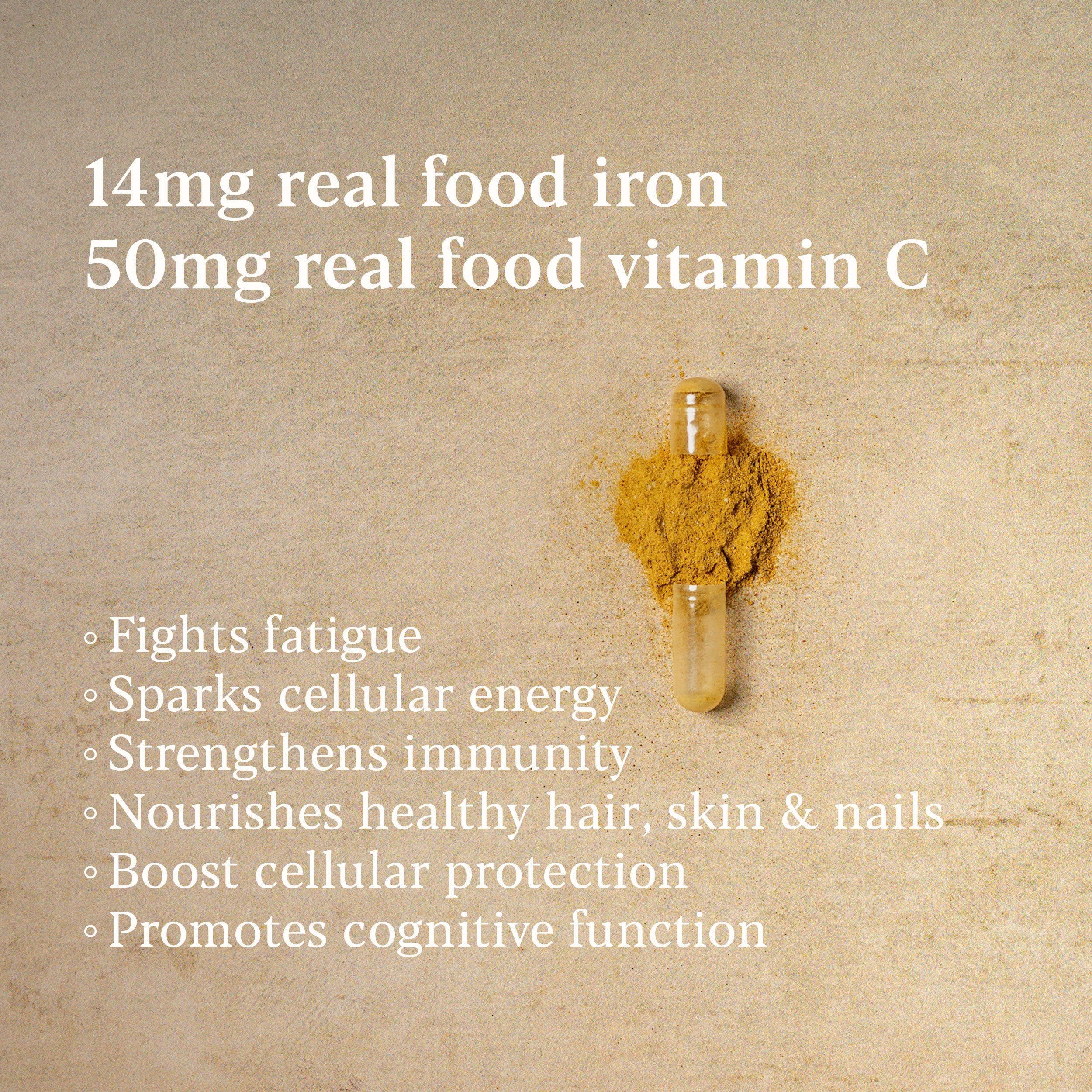 Each capsule delivers 14mg nature-made iron directly from curry leaves plus 50mg natural vitamin C from rosehips to enhance absorption.