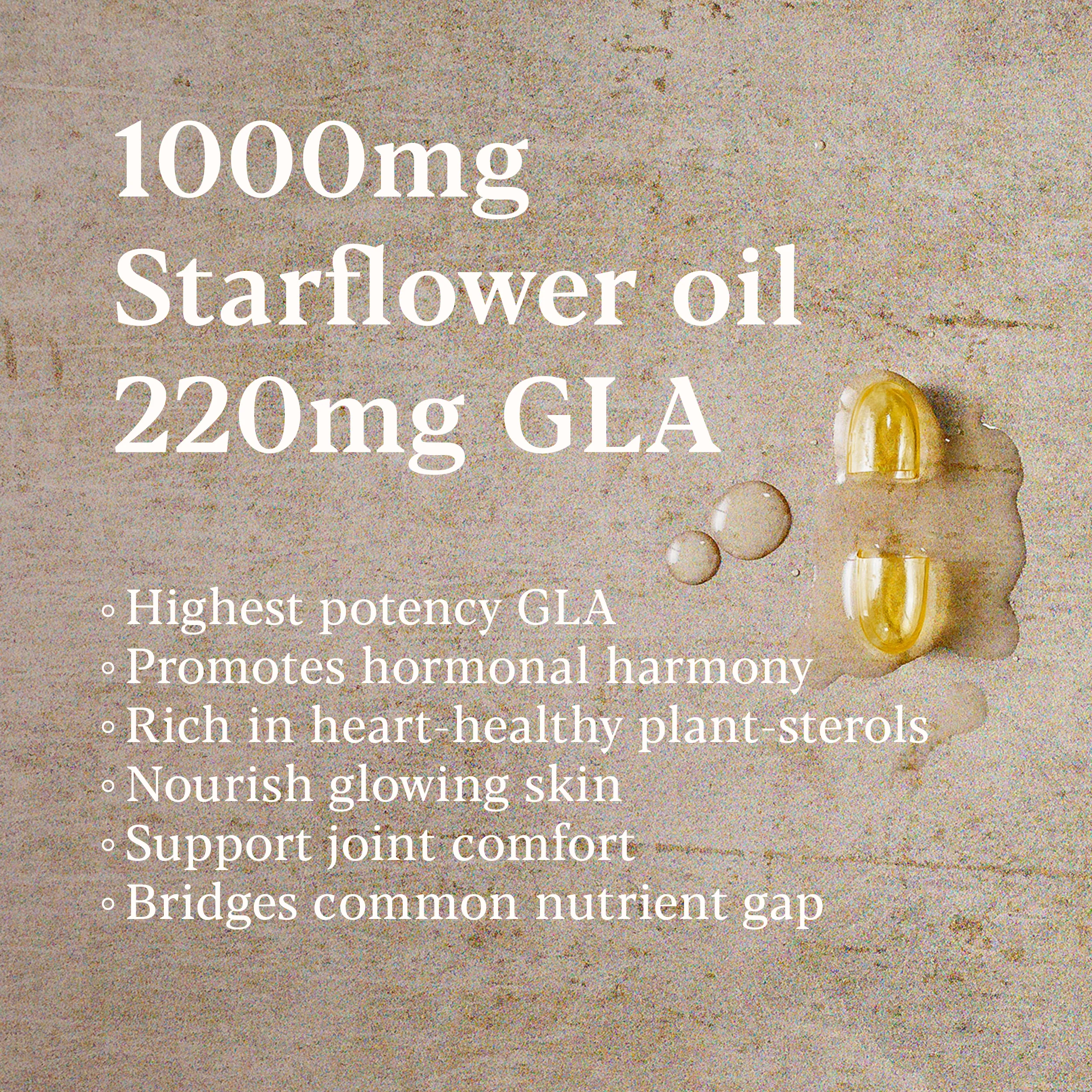 With few good food sources of GLA in the diet, starflower oil helps bridge a key nutrient gap and has proven skin health benefits. Our high potency capsules offer 1000mg starflower oil with 220mg GLA per capsule.