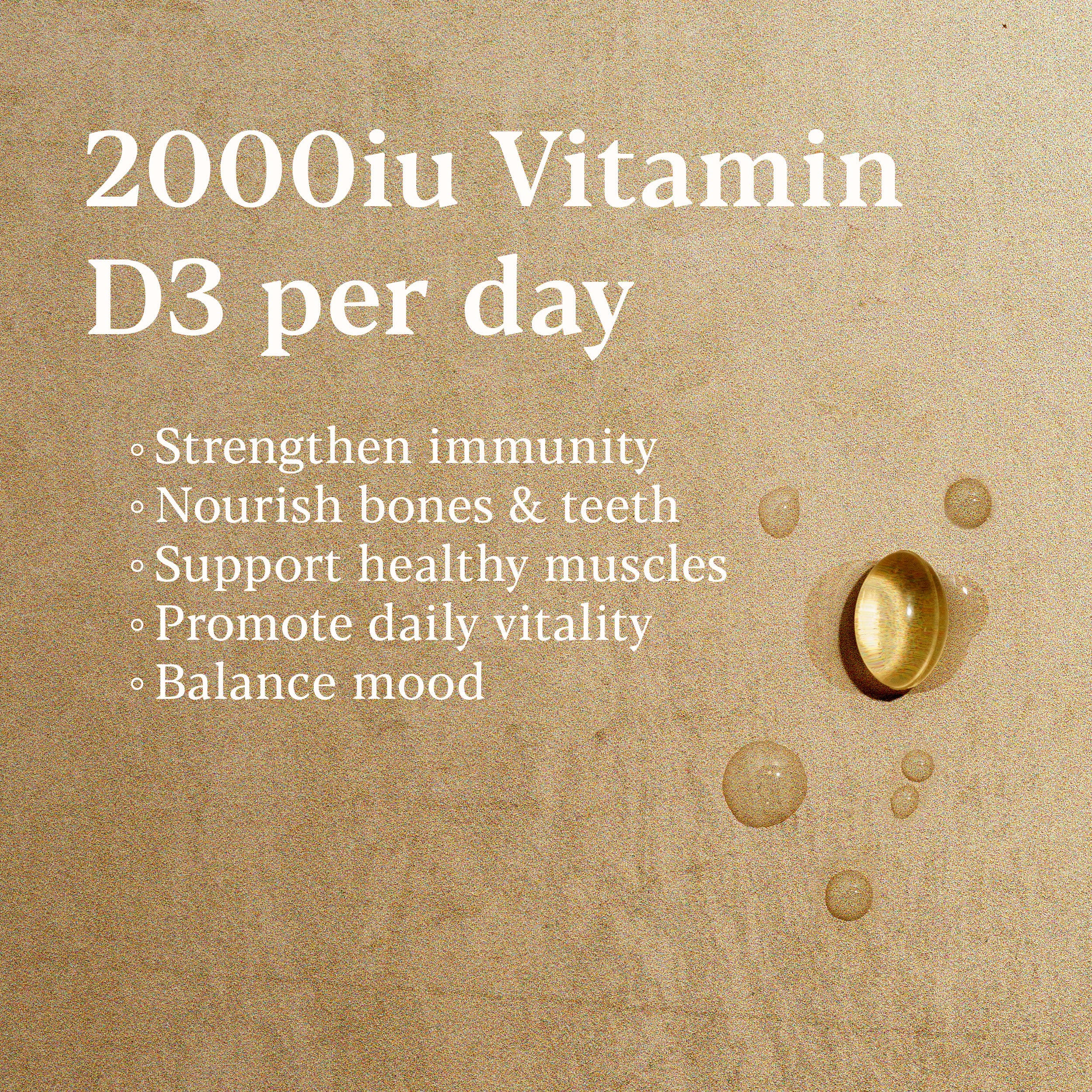 Our tiny and easy to swallow capsules deliver 2000iu of bioactive vitamin D3, in a base of sunflower oil to enhance absorption, with no unnecessary additives.